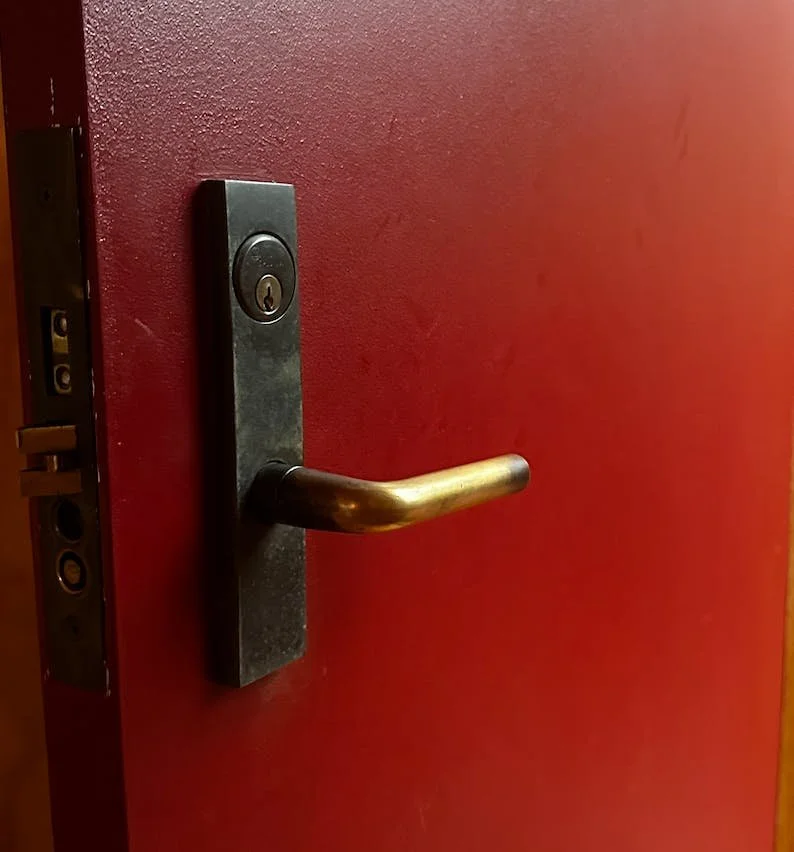 All door knobs are small simple brass door knobs. The door hardware on the front door is brass as well.