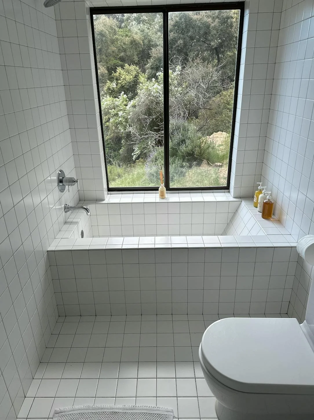 The bathrooms. You might like these, you might not. Super tight theme. Inexpensive white tile on floors and walls. Tile sinks and tub. Chrome hardware and medicine cabinet mirrors. It looks cool, it's very simple and effective.