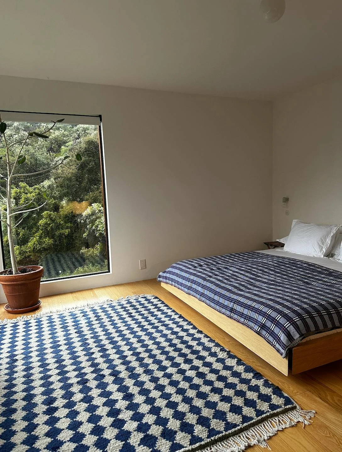 The bedrooms. Very very simple modern minimalism. In each of these spaces the used color rugs and textiles to excite things and also placed a couple older textured items.