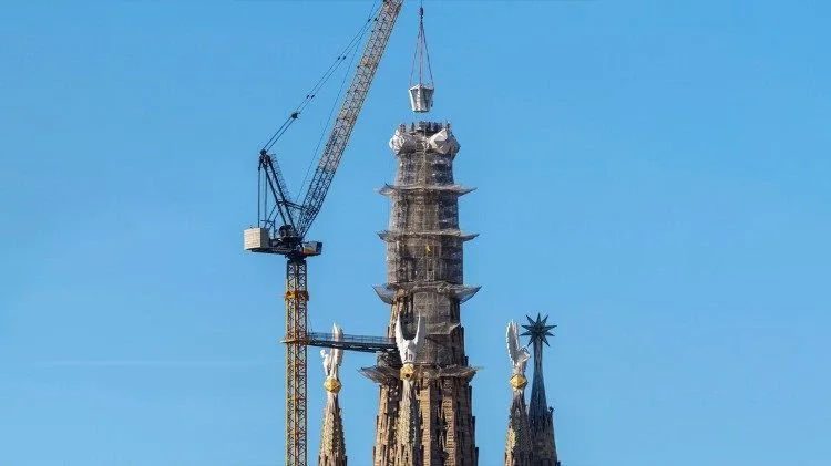 The Sagrada Família completed its final height in Barcelona yesterday. The upper arm of the cross atop the central tower was lifted into place, bringing its total height to 566 feet, the tallest structure in Barcelona.