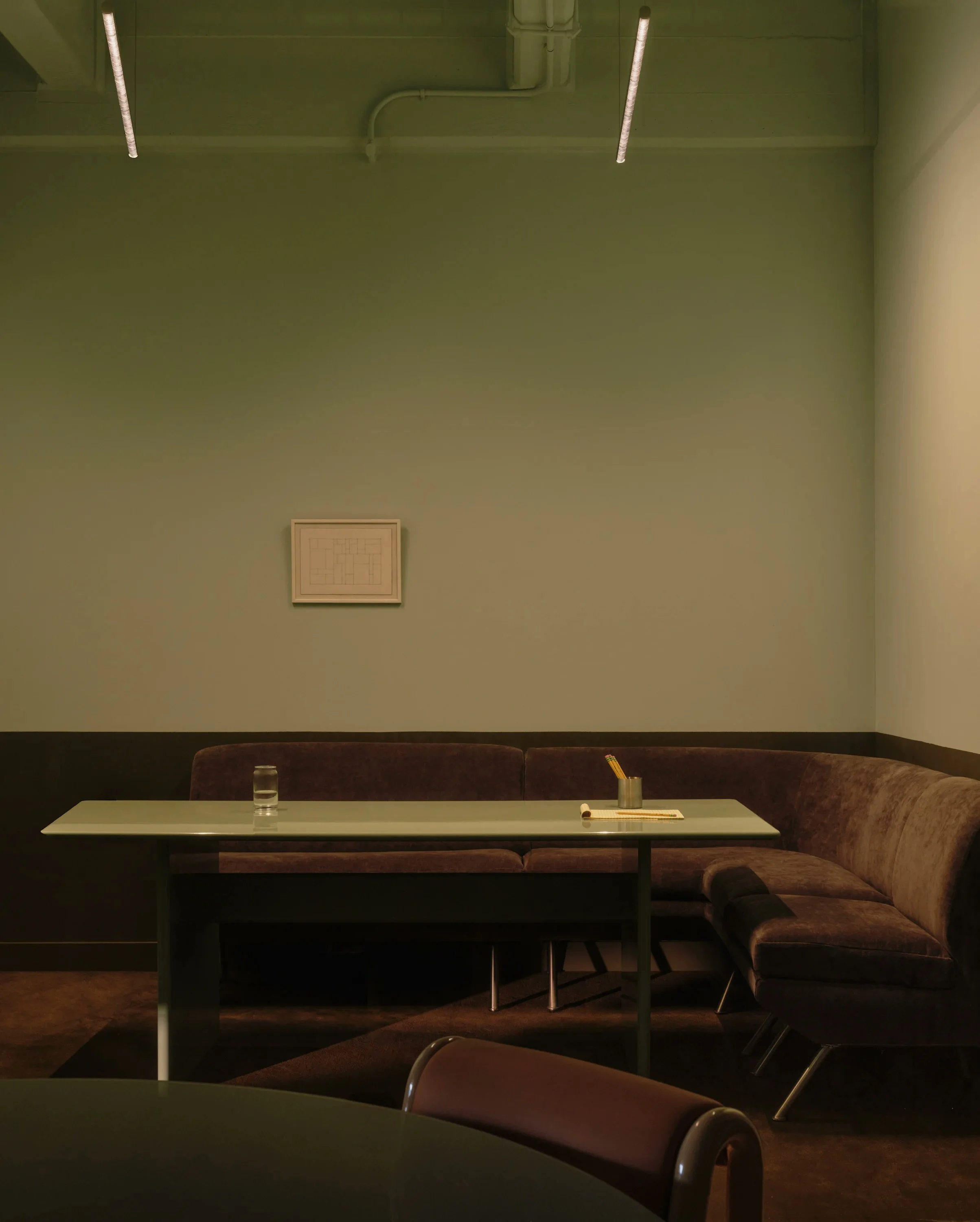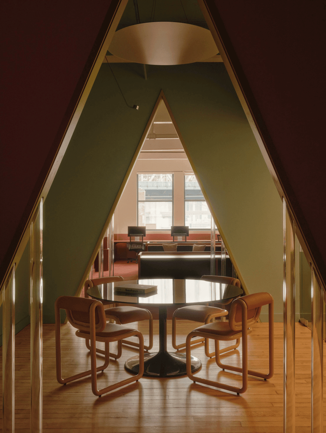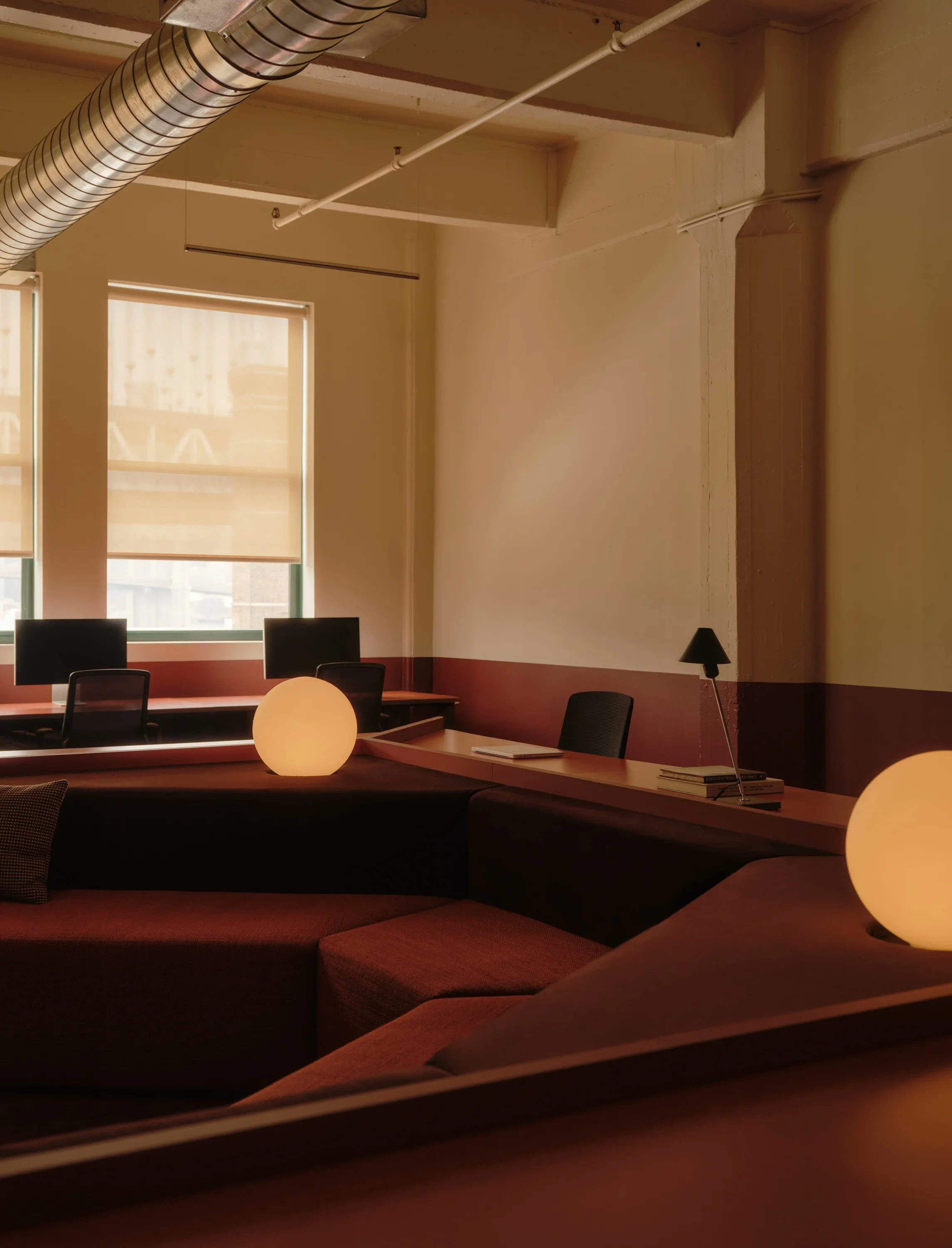 The warm retro futurism of the new Gumroad / Antiwork offices in NY. I got to chat with founder Sahil Lavingia a while back, and he's a very inspiring guy, and I love his book. What I like most about this project is the use of paint as wainscoting to create visual weight. The lower third of the walls is painted a darker color to coordinate with the furniture, while the upper portion is painted lighter to create a light, airy feel.