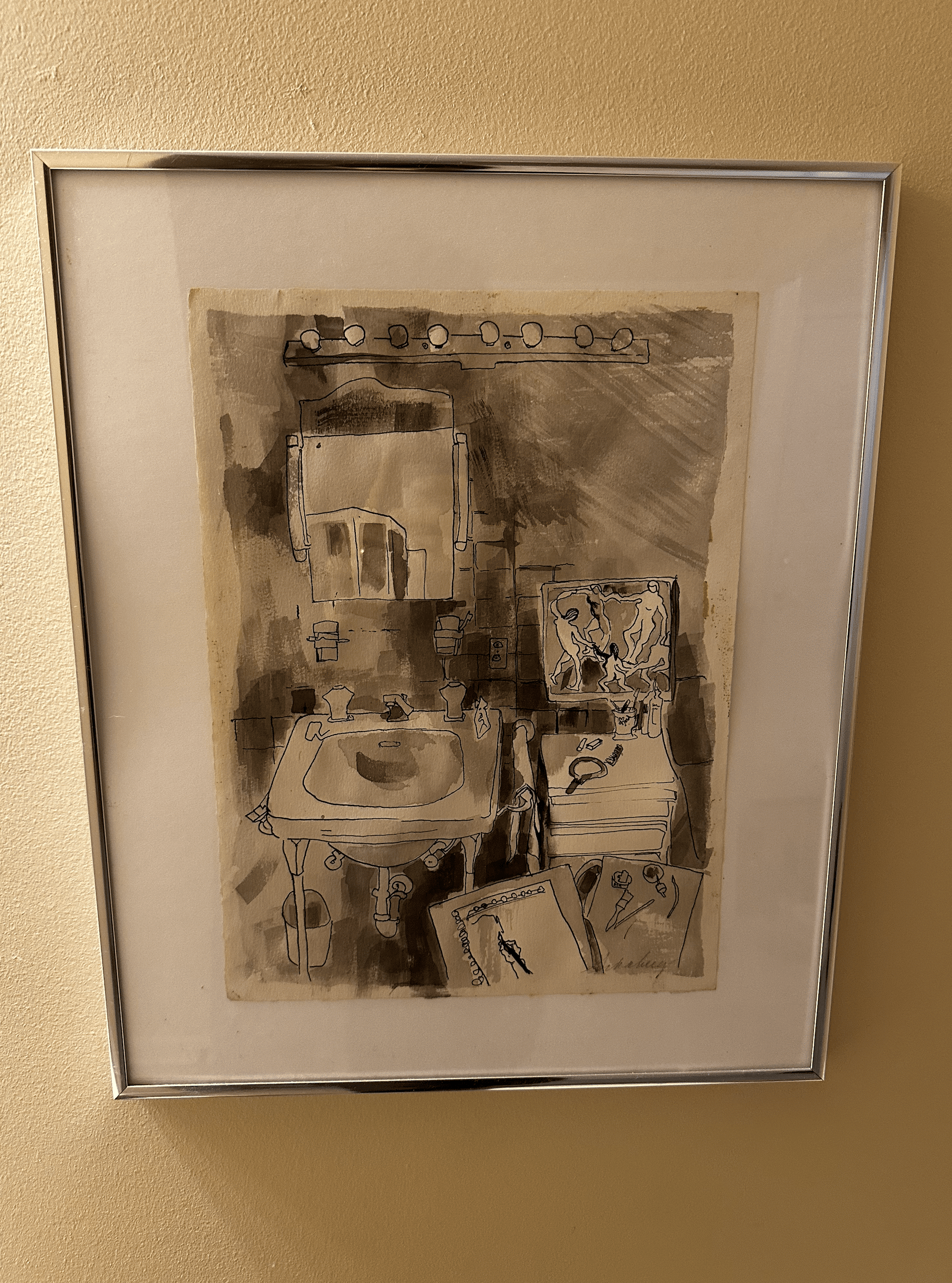 This is a watercolor sketch my Grandma made of the bathroom from her old house that I remember so well. Now hangs in her new bathroom. I love her loose, sketchy style.