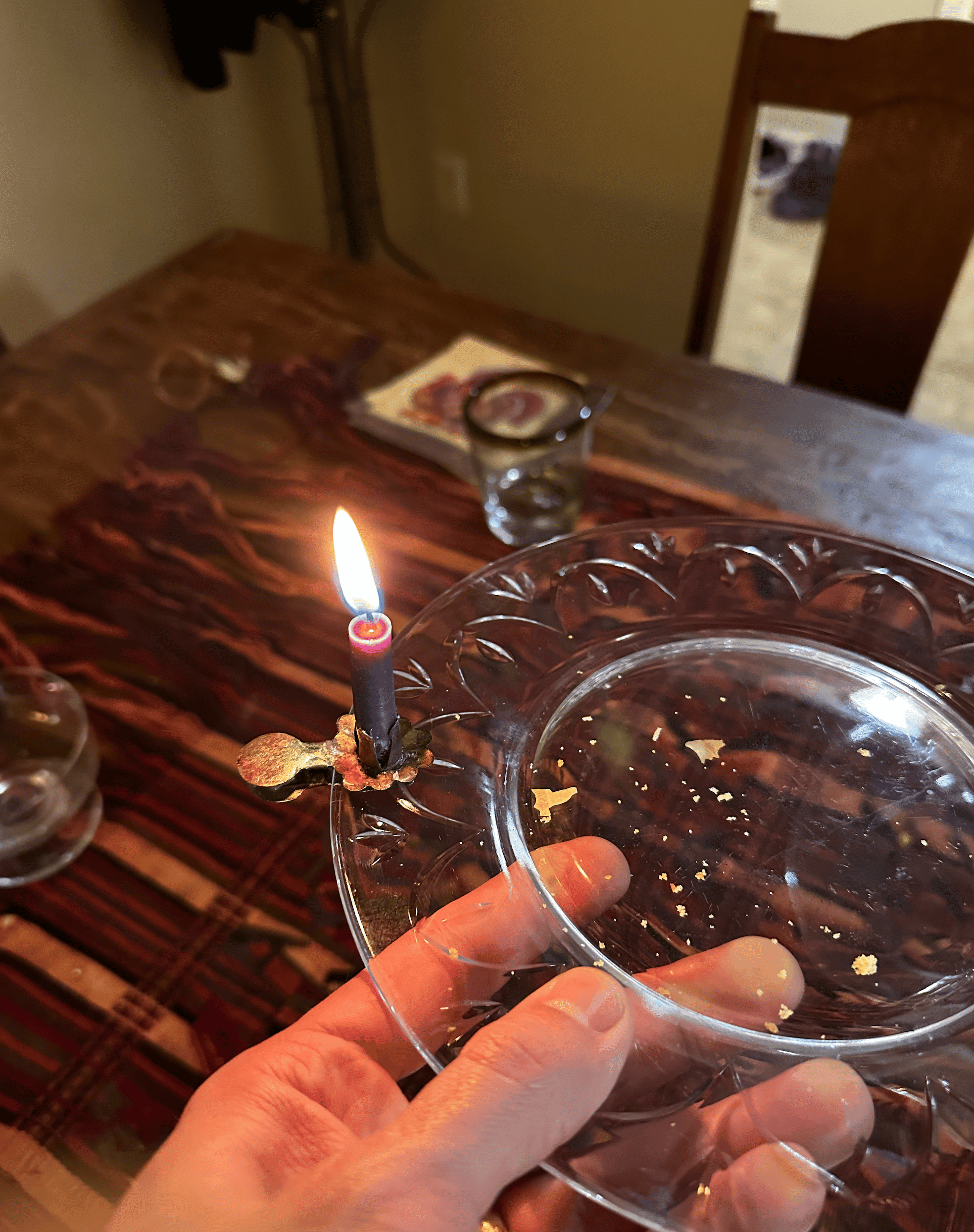 After dinner, we had dessert on these glass plates. My aunt clipped little vintage Christmas tree candle holders to them, stuck a birthday candle in each, lit them, and then everyone blew out their candles before eating. I had completely forgotten about this, but it was always the way we ate dessert with them when I was a kid. It's probably been 20-25 years since the last time I did this!