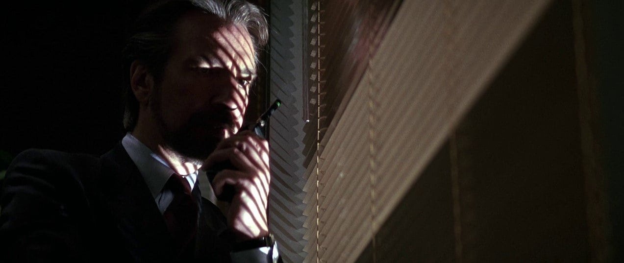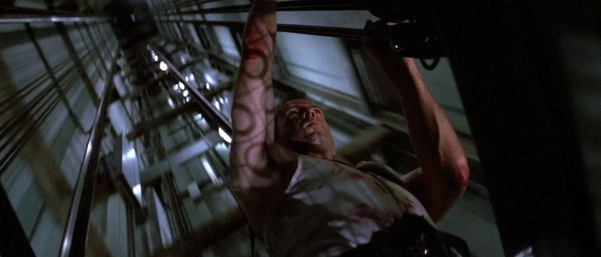 If you wanted to create a design formula for the Die Hard aesthetic, it might be aluminum blinds + large plants + spotlight lighting + reddish wood paneling + concrete and steel walls + metal panels with buttons.