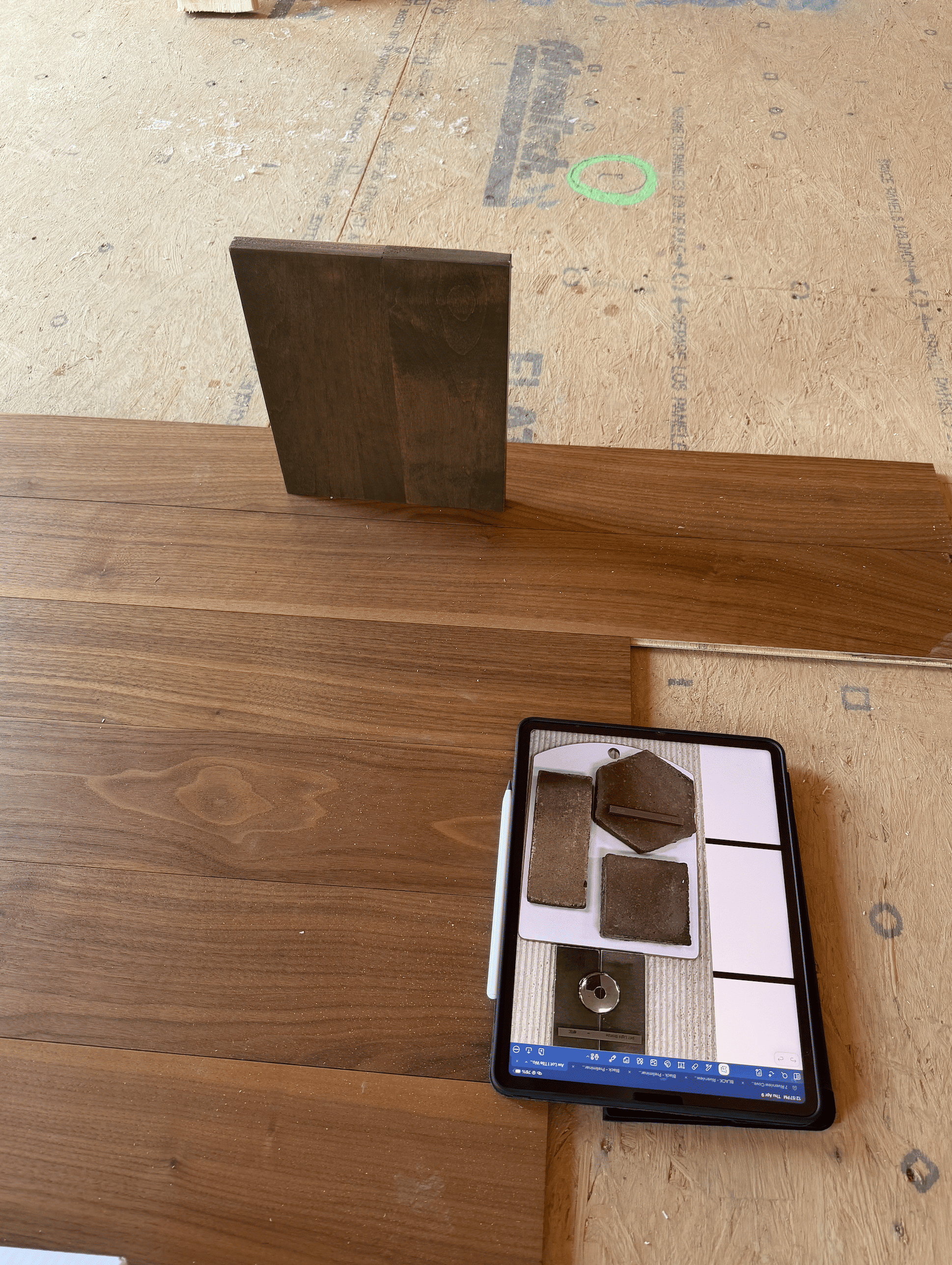 The cabinet sample is the one that's standing up. You can also see some of our tile choices for the bath. Moody restraint is the vibe.