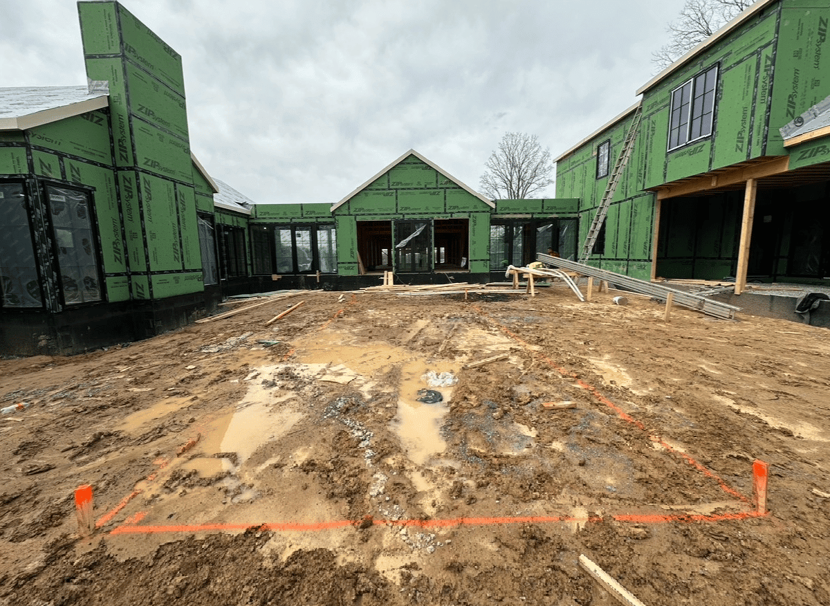 It's U-shaped and built around a large central courtyard, which is currently a giant mud pit. We're finalizing the pool design now, but it will be long and skinny, and surrounded by trees, lounge areas, boulders, and decomposed granite paths with pavers.